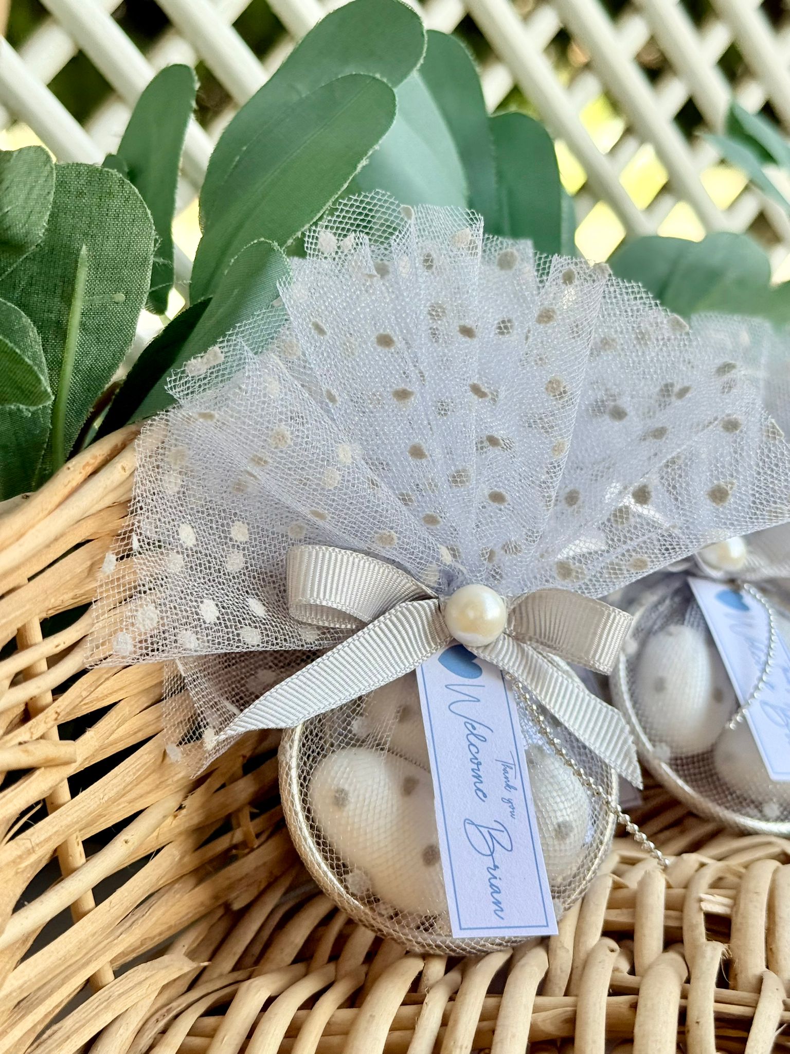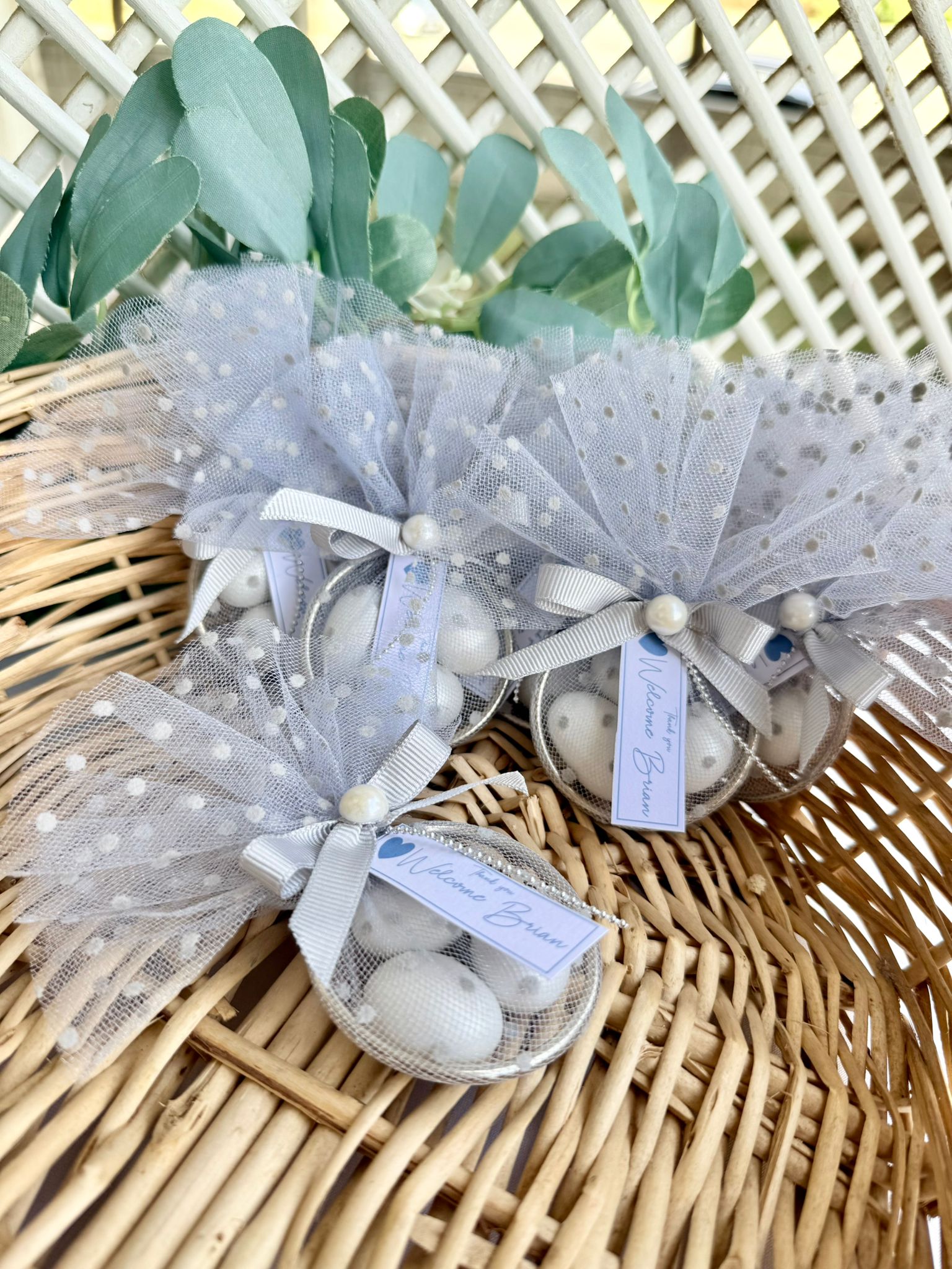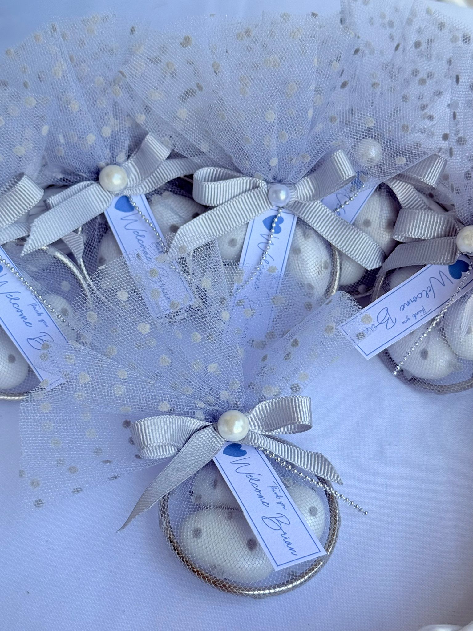 Şık tül kesesi, inci detaylı kurdele ve kişiye özel etiket tasarımıyla hazırlanmış bu hediyelik, özel günlerinizde misafirlerinize zarif bir hatıra sunar. İçerisinde kalp formunda şekerler/çikolatalar yer almakta olup, hem hoş bir sunum hem de tatlı bir ikram alternatifi sağlar.