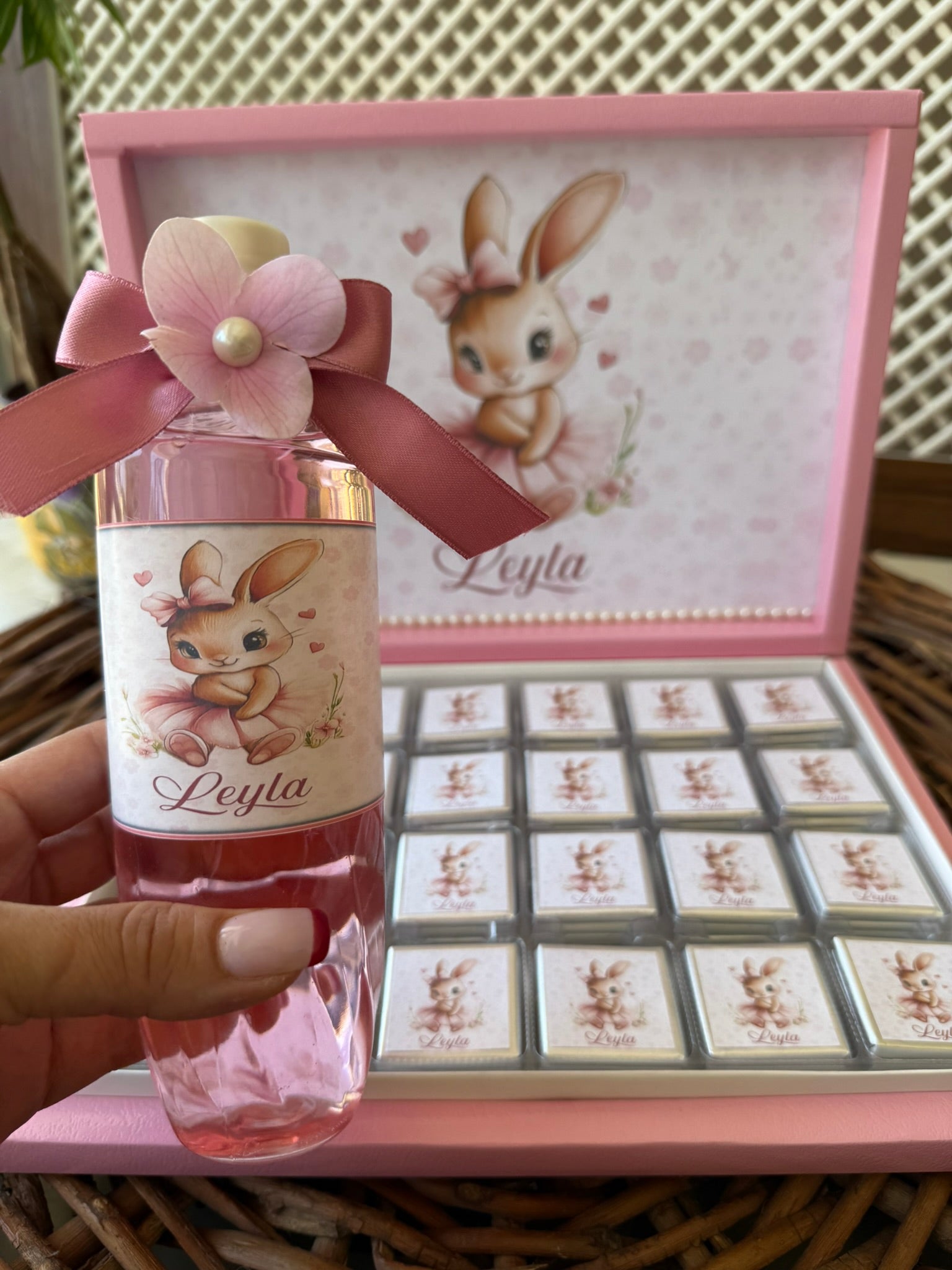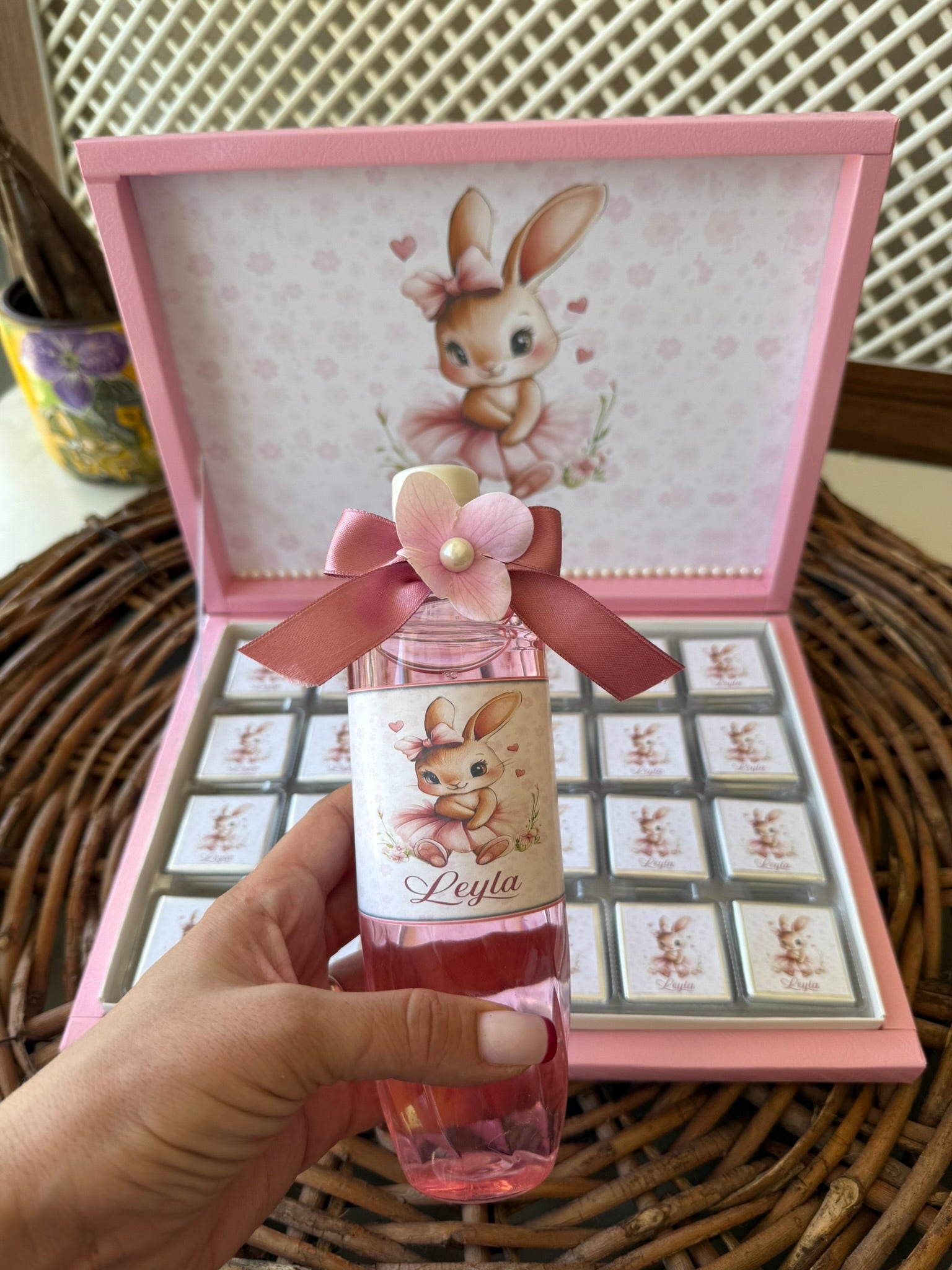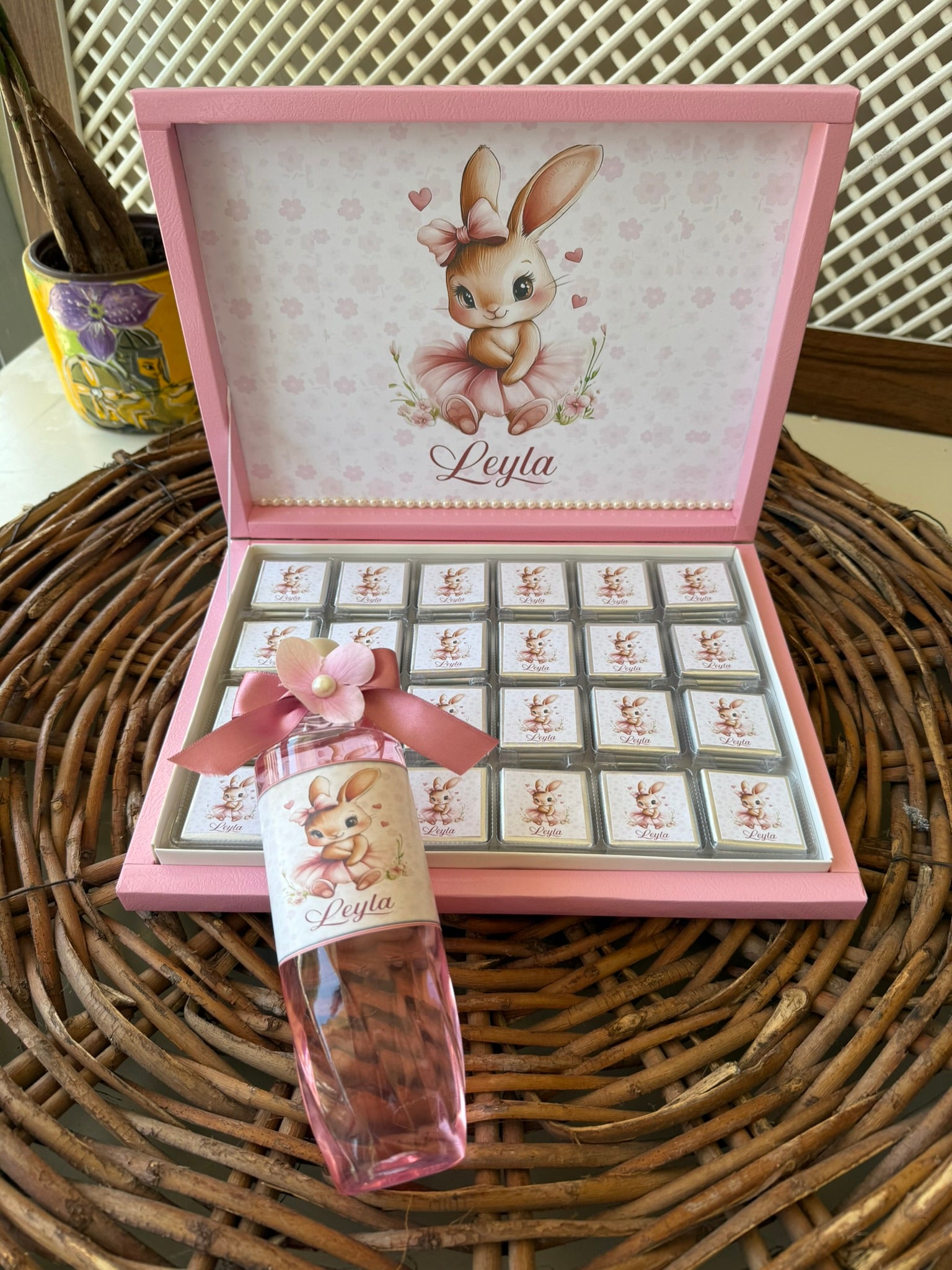 İsme Özel Kolonya-Çikolata Tavşan Modelli Kız Bebek Seti 48 Adet (Doğum, Doğum Günü, Mevlit Hediyelik)