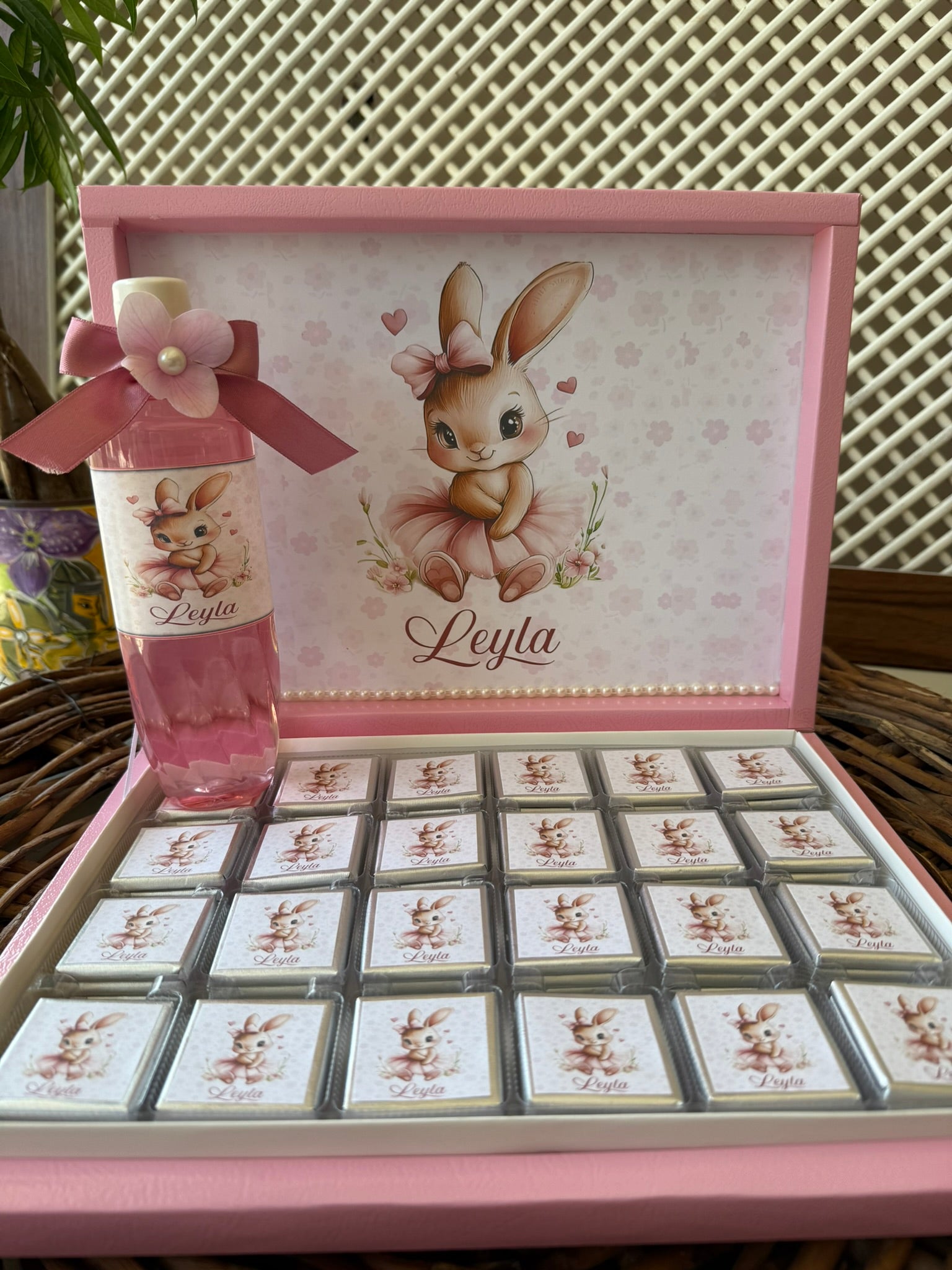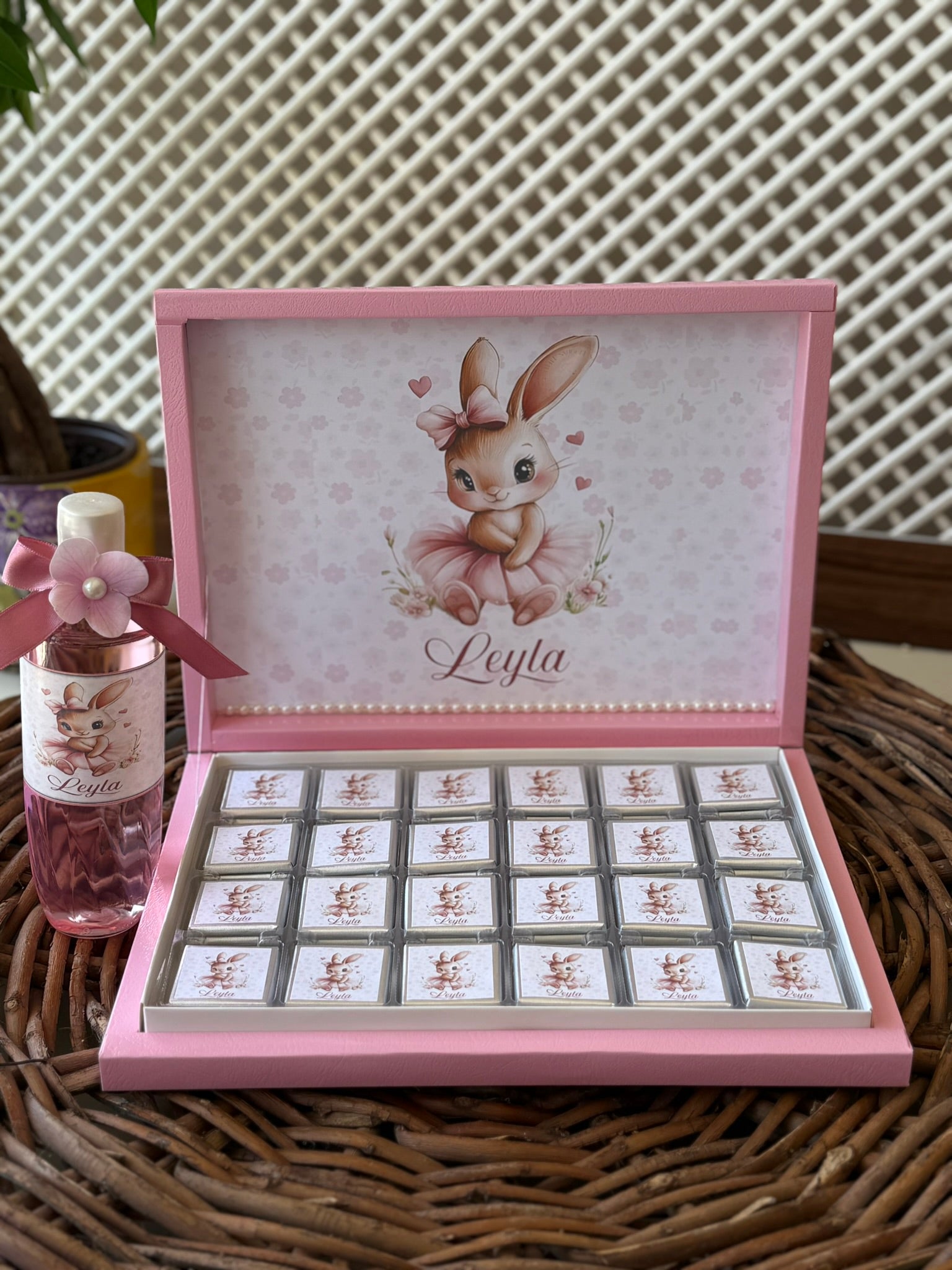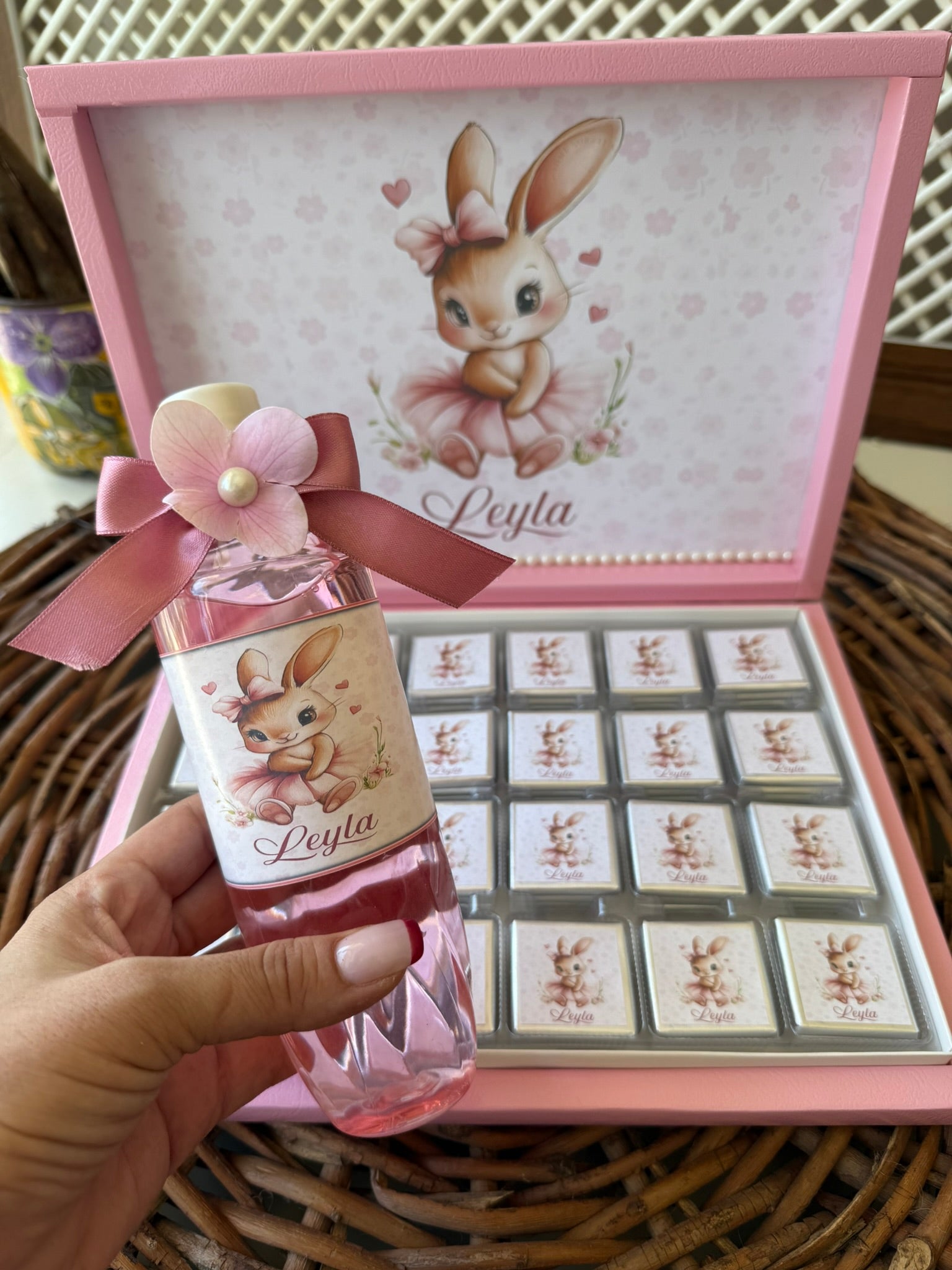 İsme Özel Kolonya-Çikolata Tavşan Modelli Kız Bebek Seti 72 Adet (Doğum, Doğum Günü, Mevlit Hediyelik)