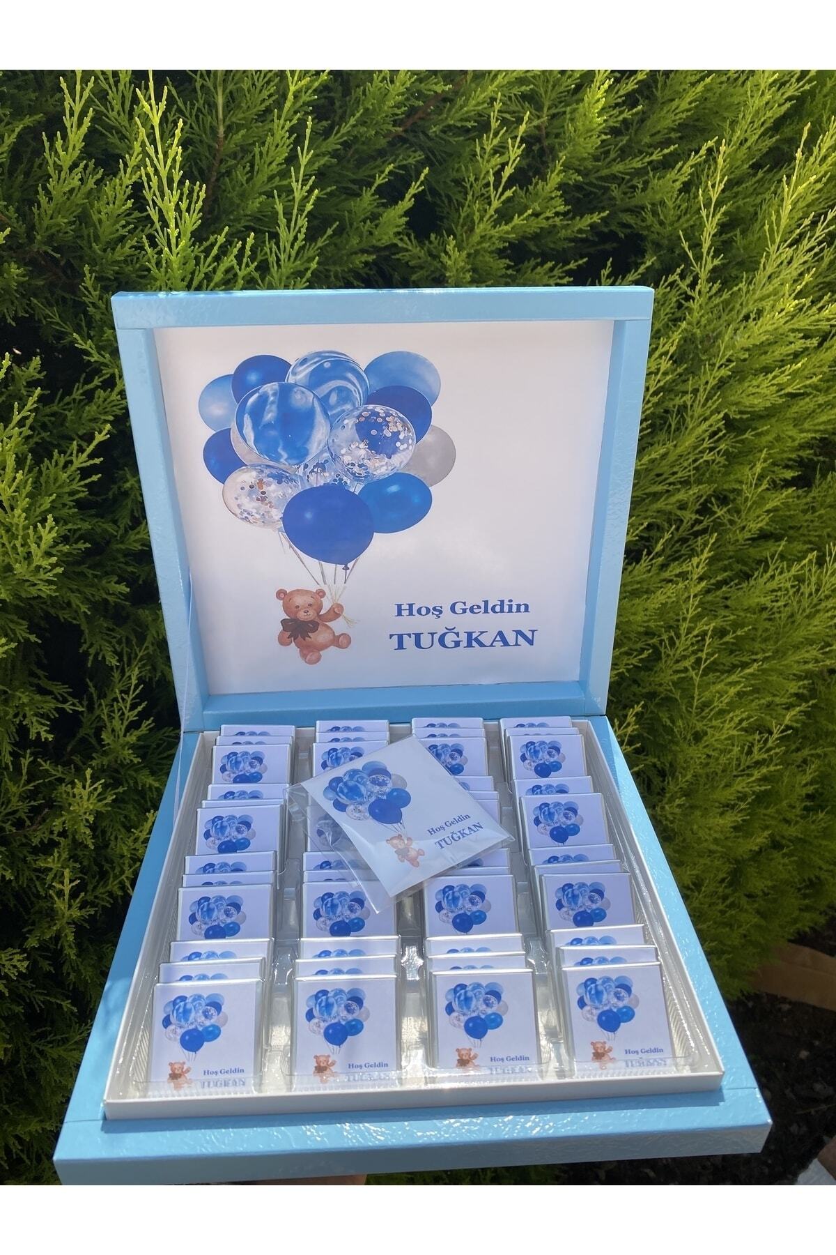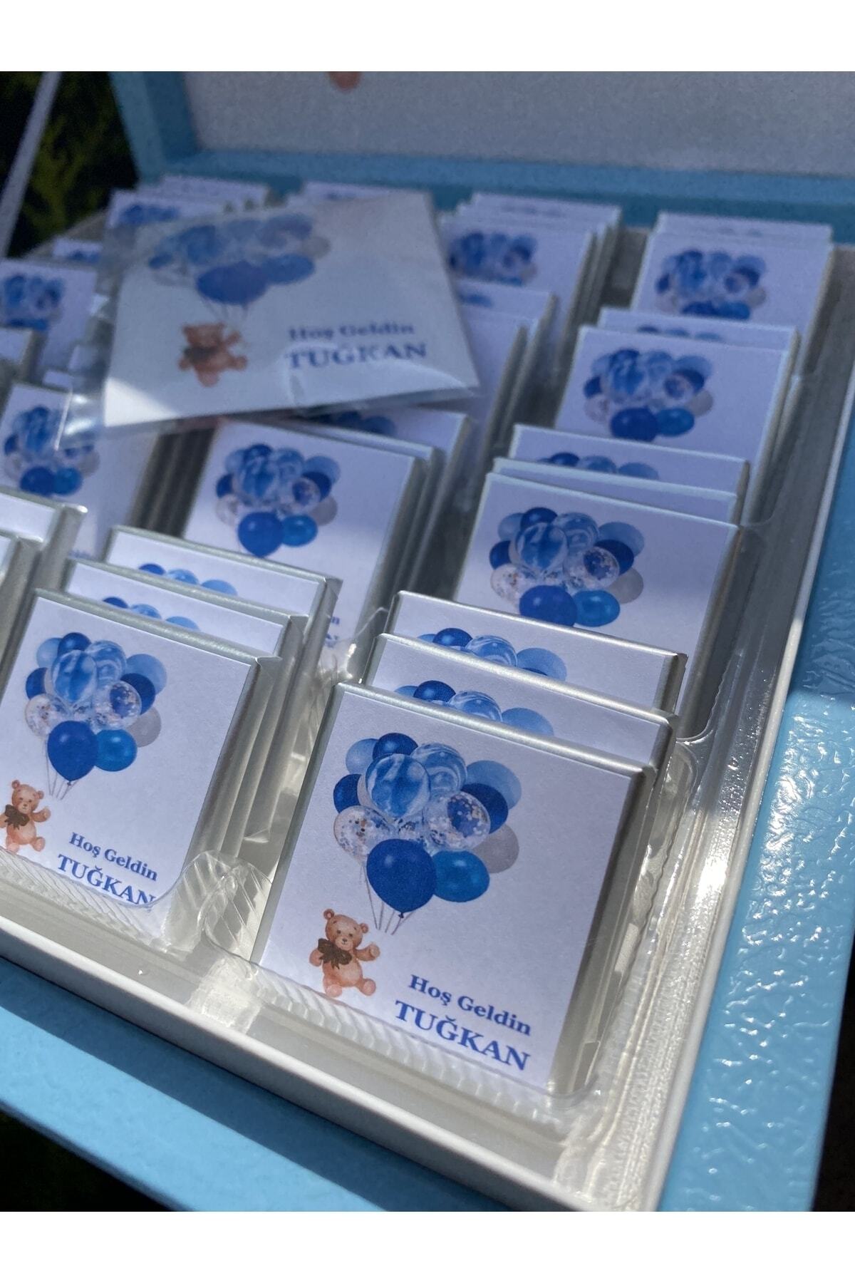 İsme Özel Mavi Balonlu Erkek Bebek Çikolatası 48 Adet (Doğum, Doğum Günü, Mevlit Hediyelik)