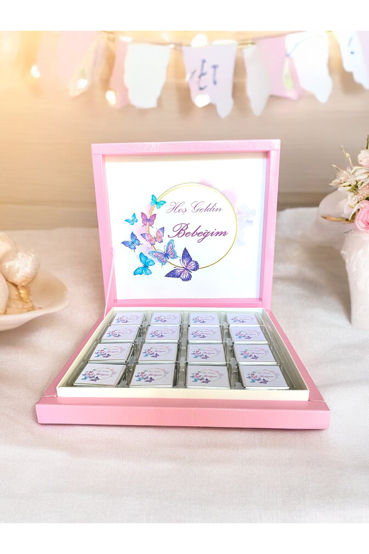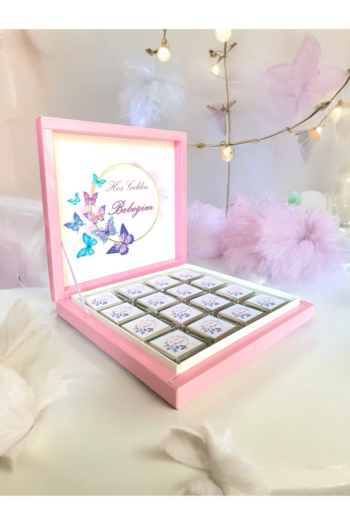 İsme Özel Kelebek Modelli Kız Bebek Çikolatası 48 Adet (Doğum, Doğum Günü, Mevlit Hediyelik)