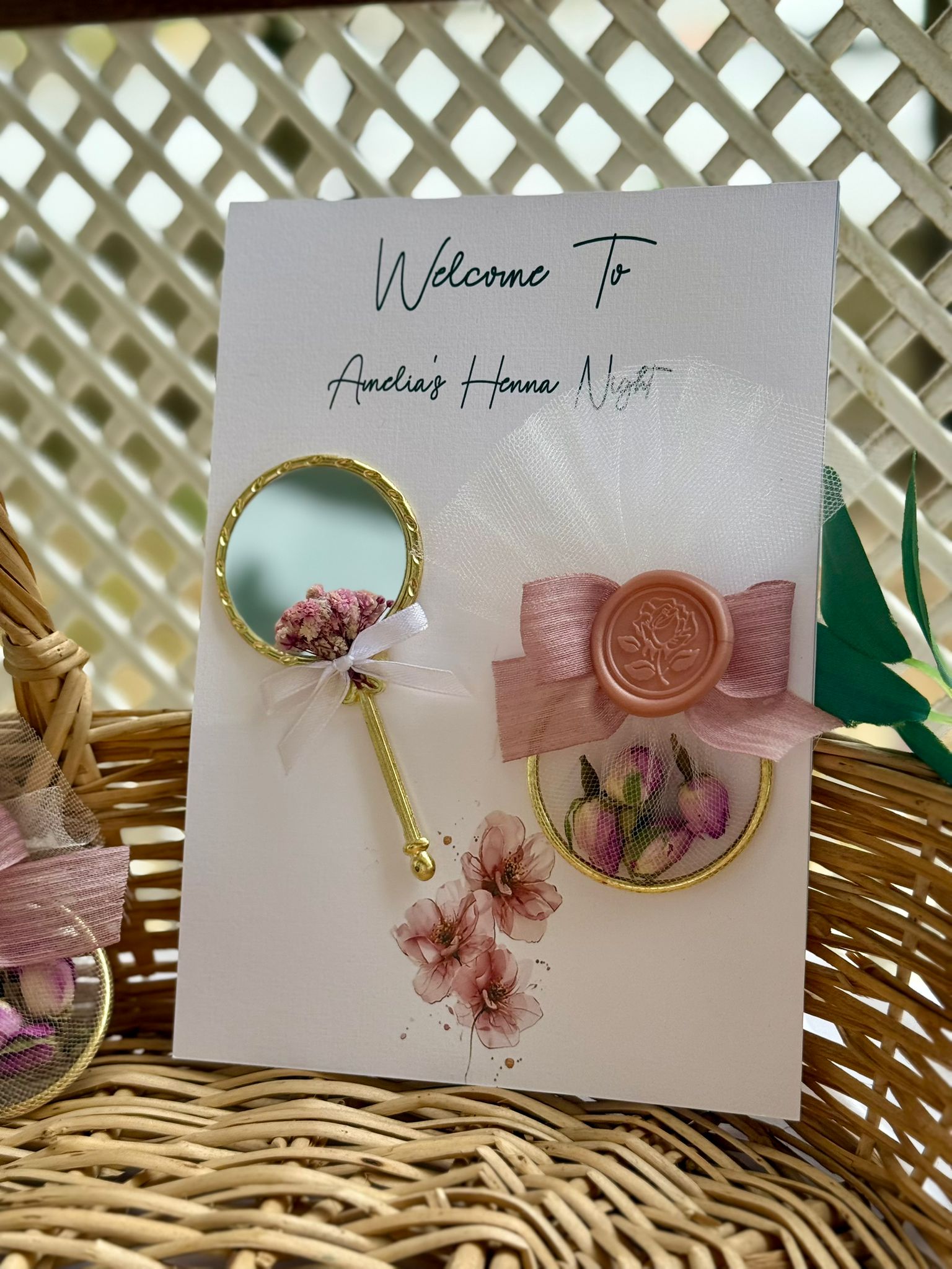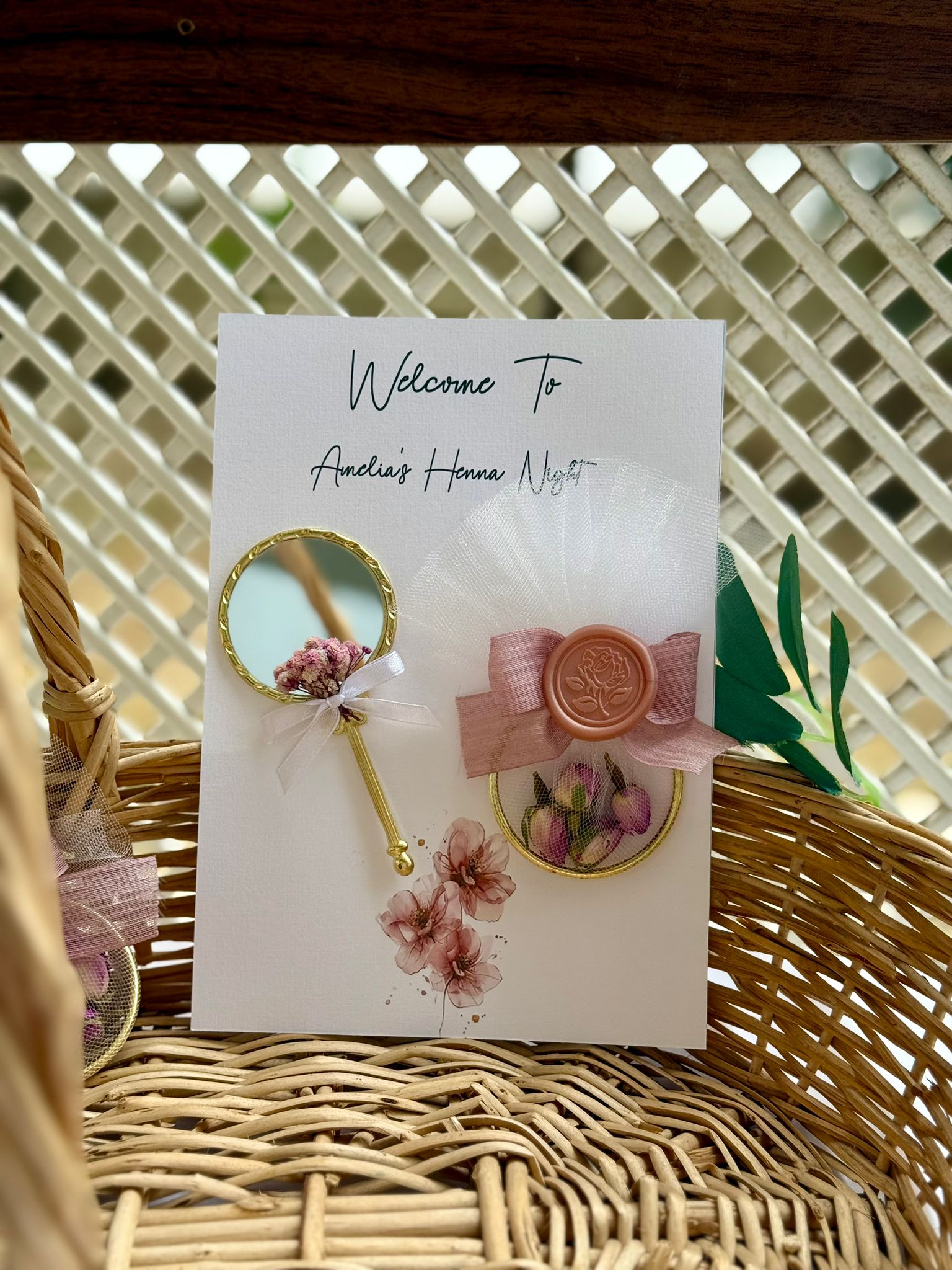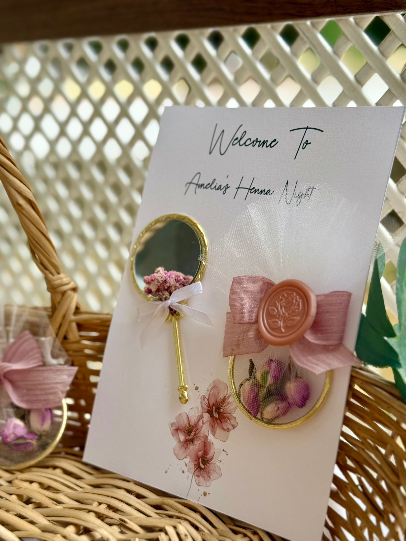 Şıklığı ve anlamlı detaylarıyla öne çıkan bu özel tasarım hediye seti, kına gecesi ve nişan organizasyonlarınıza zarafet katıyor. Set içerisinde şık altın çerçeveli minik ayna, kurutulmuş çiçek ve fiyonk detaylarıyla süslenmiş tül kese ve kişiye özel tasarım kart yer almaktadır. Modern dokunuşlarla hazırlanmış bu hediyelik, misafirlerinize unutulmaz bir hatıra sunar.