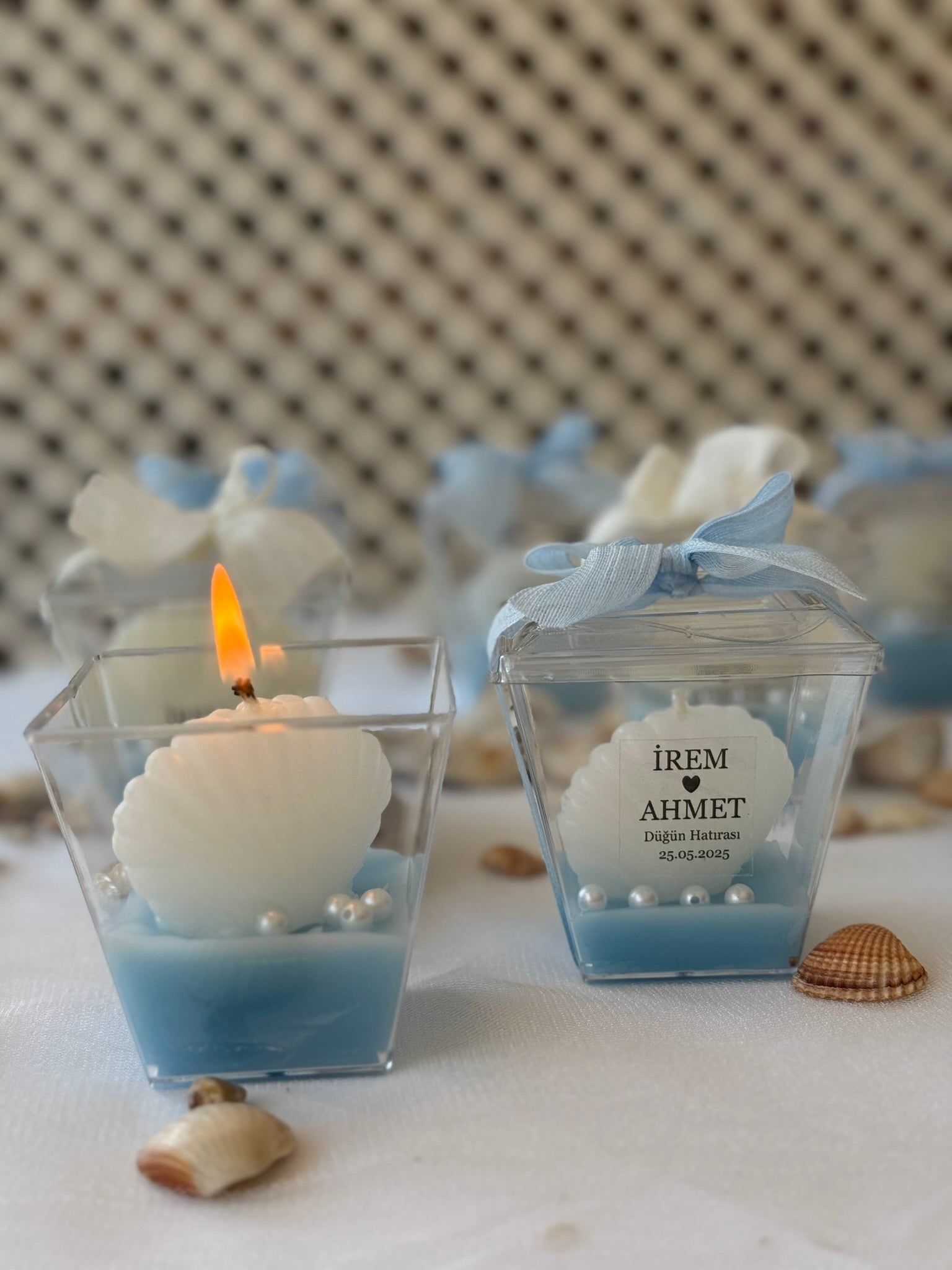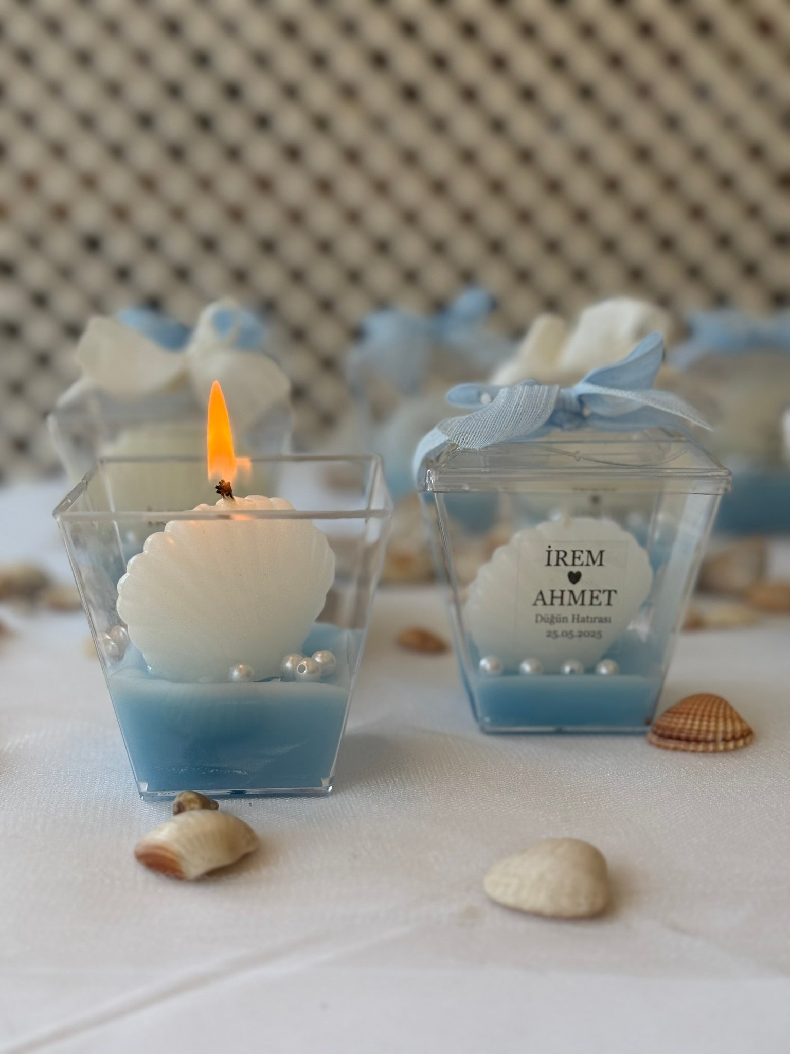 Deniz esintisini taşıyan özel tasarım deniz kabuğu mum şeffaf kutusunda, mavi jel zemin üzerinde inci detaylarıyla hazırlanmıştır. Üzeri zarif beyaz kurdele ve inci süslemesiyle tamamlanarak şık bir hediye haline gelir.
