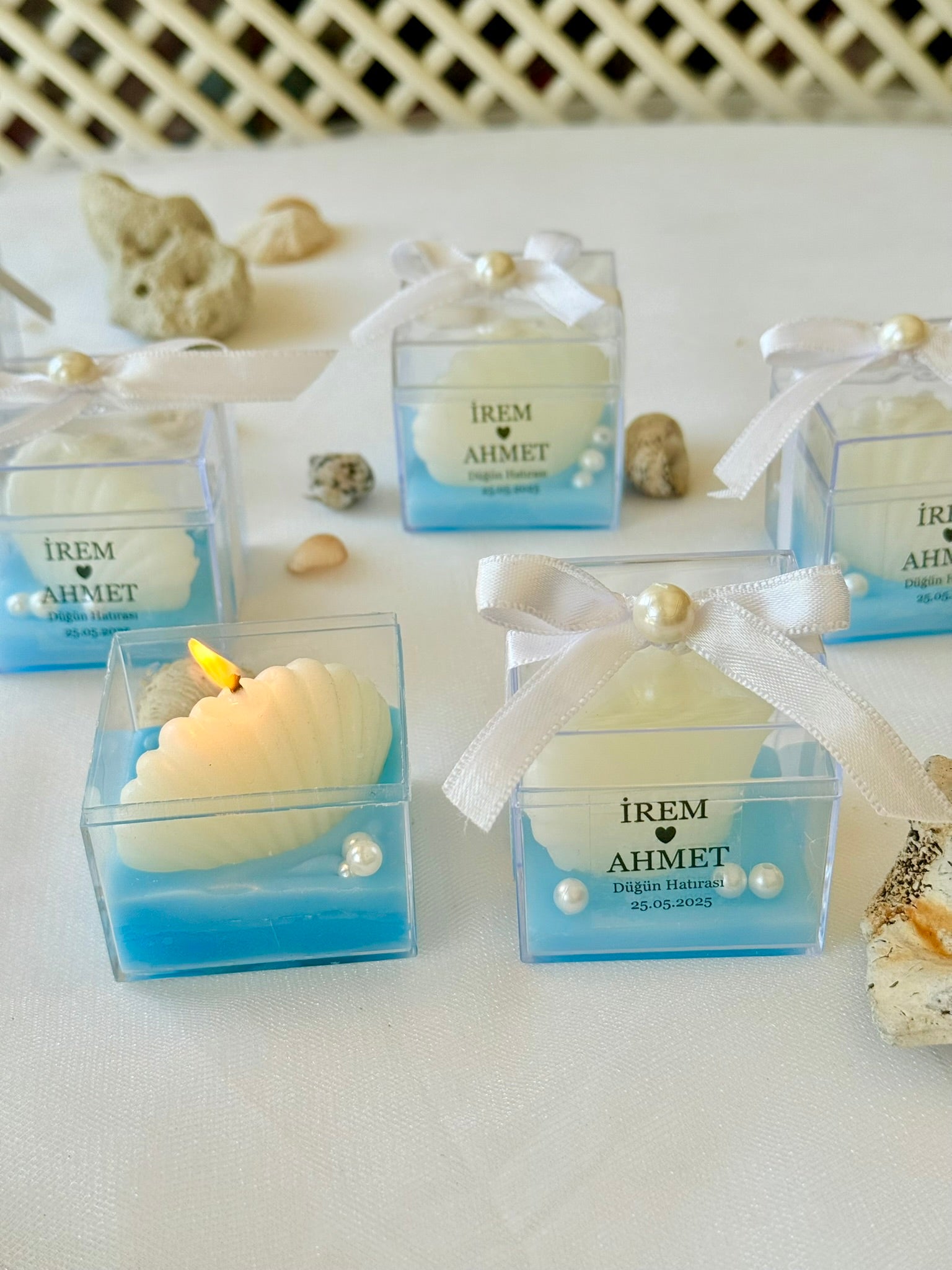 Deniz esintisini taşıyan özel tasarım deniz kabuğu mum şeffaf kutusunda, mavi jel zemin üzerinde inci detaylarıyla hazırlanmıştır. Üzeri zarif beyaz kurdele ve inci süslemesiyle tamamlanarak şık bir hediye haline gelir.