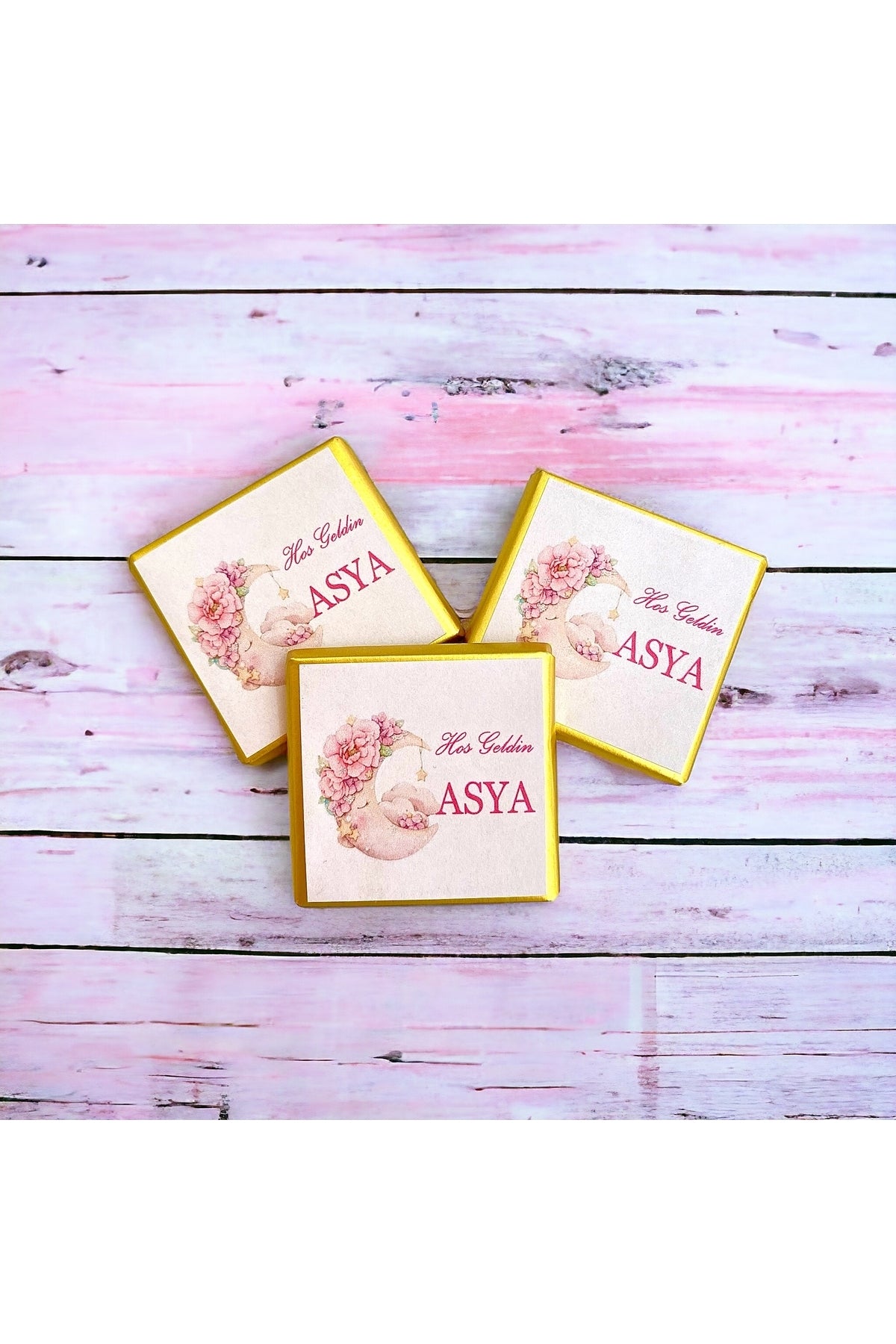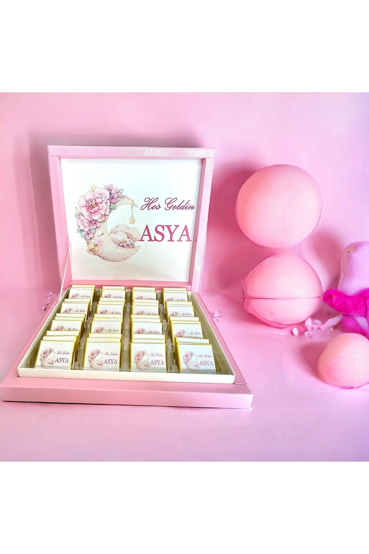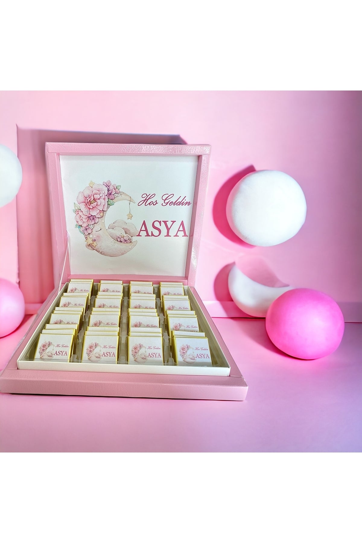 İsme Özel Ay-Yıldız Çiçek Modelli Kız Bebek Çikolatası 48 Adet (Doğum, Doğum Günü, Mevlit Hediyelik)