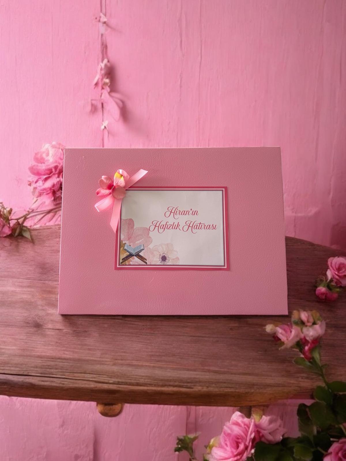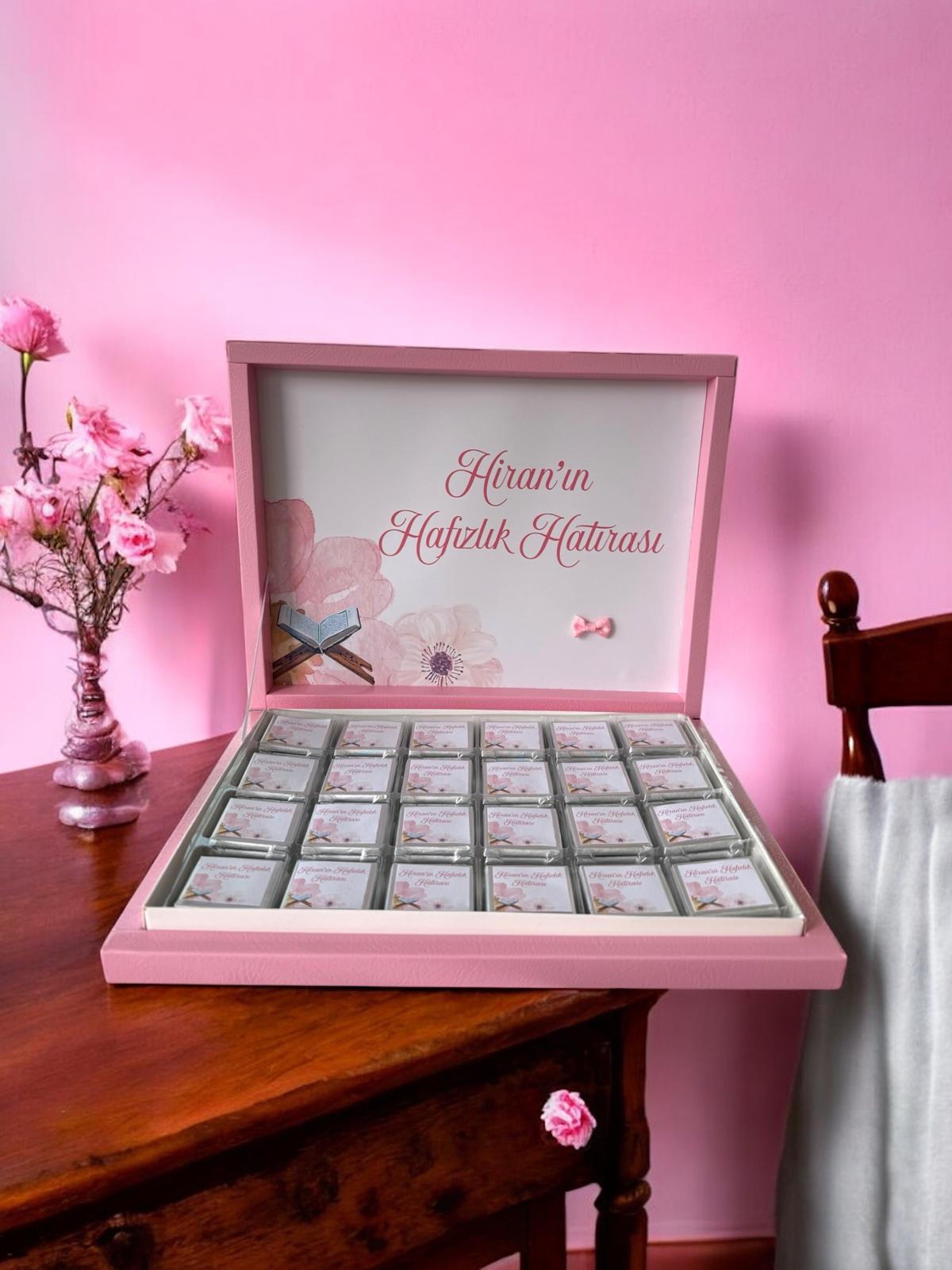 Kişiye özel tasarlanan Hafızlık Hatırası Çikolata Kutusu, zarif pembe deri kaplı kutusunda 72 adet çikolata ile hazırlanır. Çikolataların her biri özel baskılı kağıtlara sarılmış olup, isim ve “Hafızlık Hatırası” yazısı ile kişiselleştirilir.
