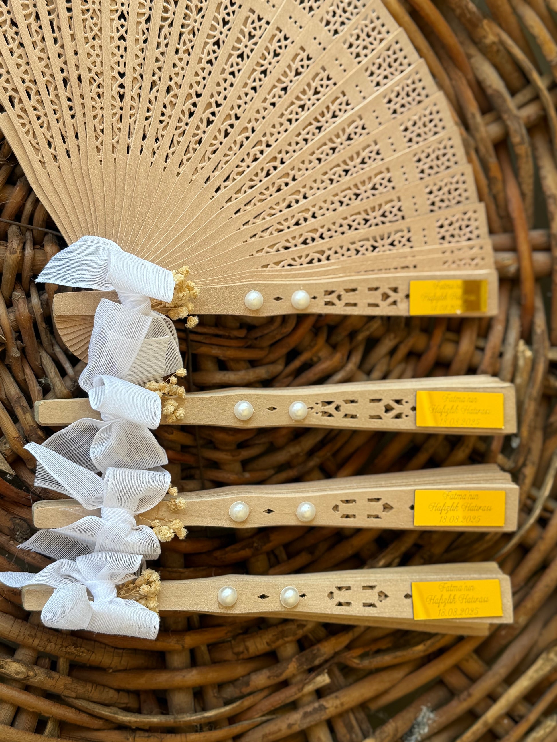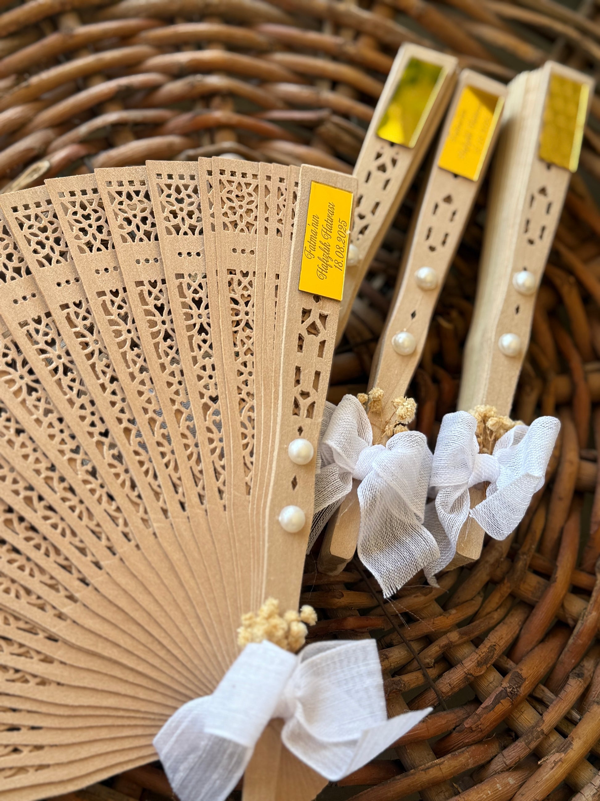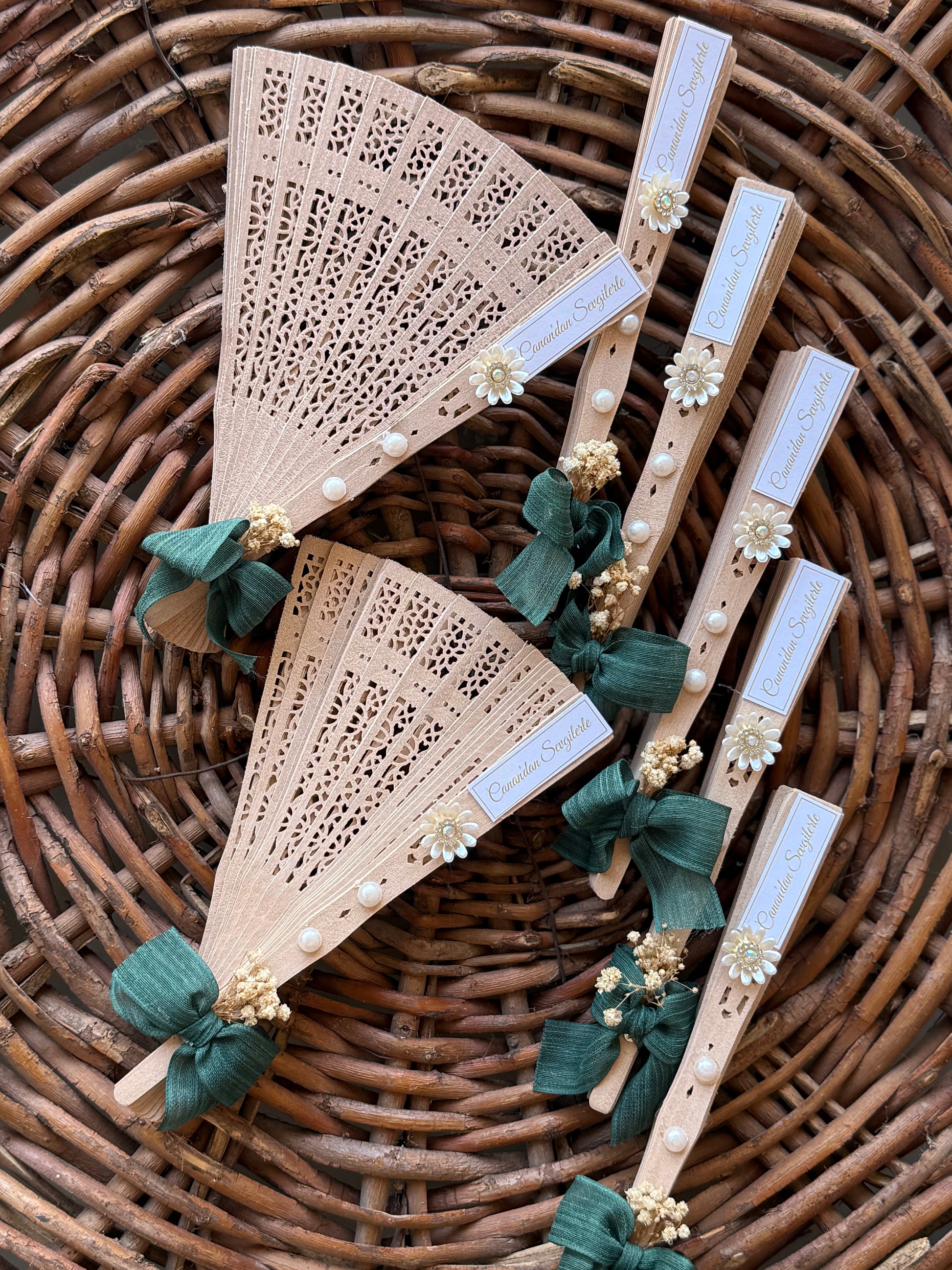 Doğal ahşap dokusuyla özenle tasarlanmış özel yelpaze hediyelik, zarif işlemeleri ve kişiye özel detaylarıyla en anlamlı günlerinizde misafirlerinize unutulmaz bir hatıra sunar. Üzerinde inci süslemeleri, yeşil kurdele ve minik kuru çiçek detayıyla tamamlanmıştır. Şeffaf kutusunda şık bir sunumla gönderilir.