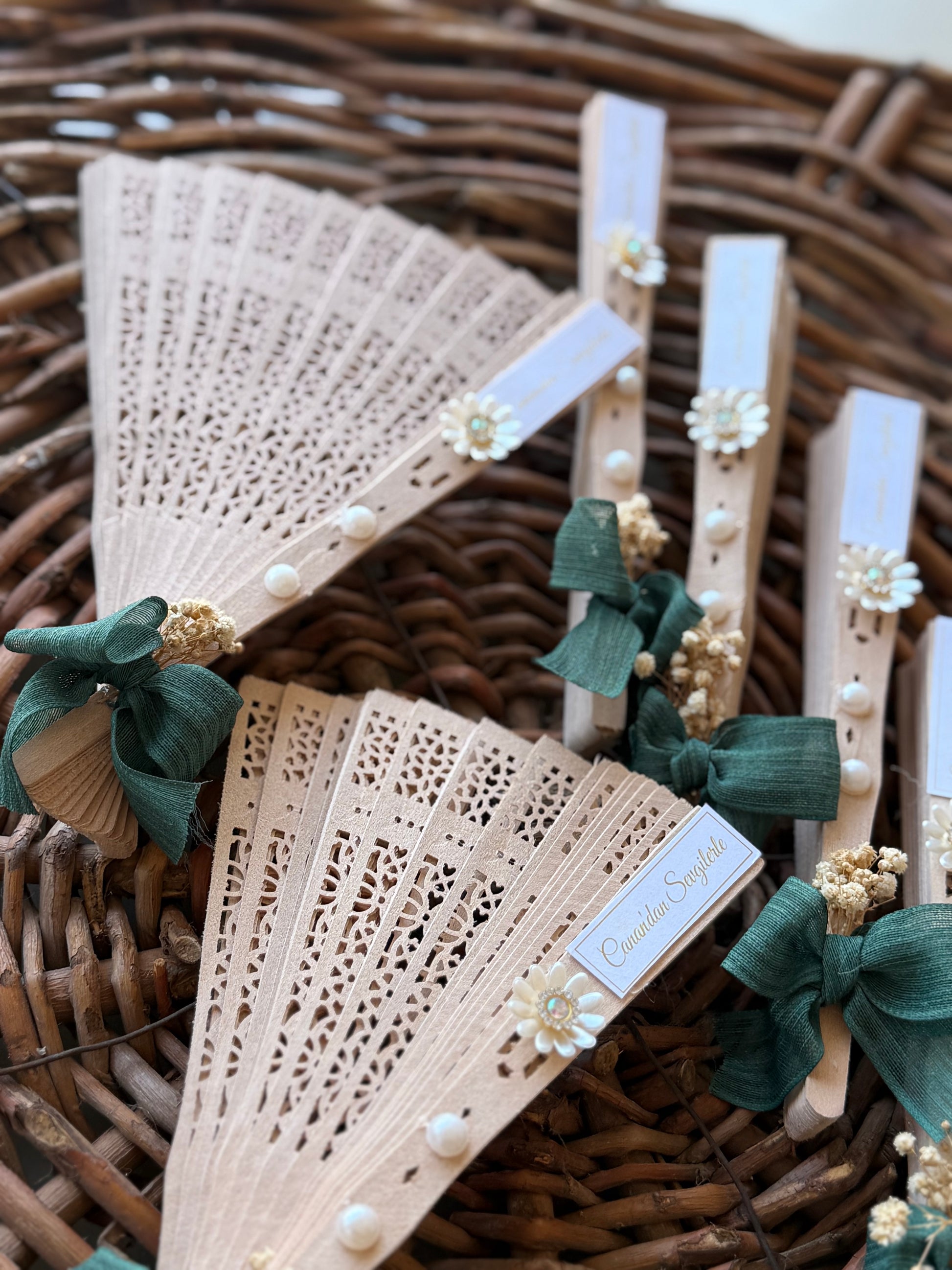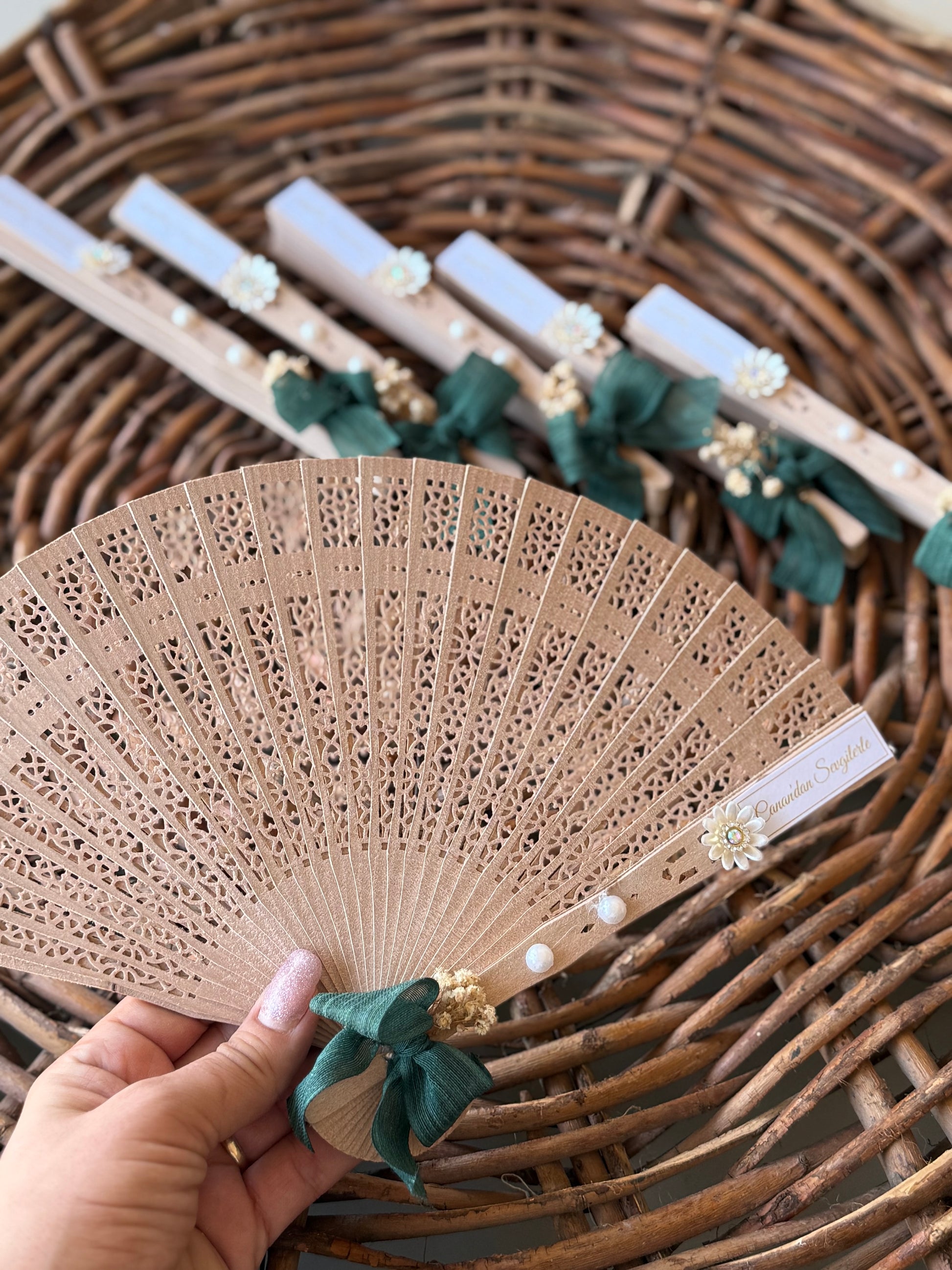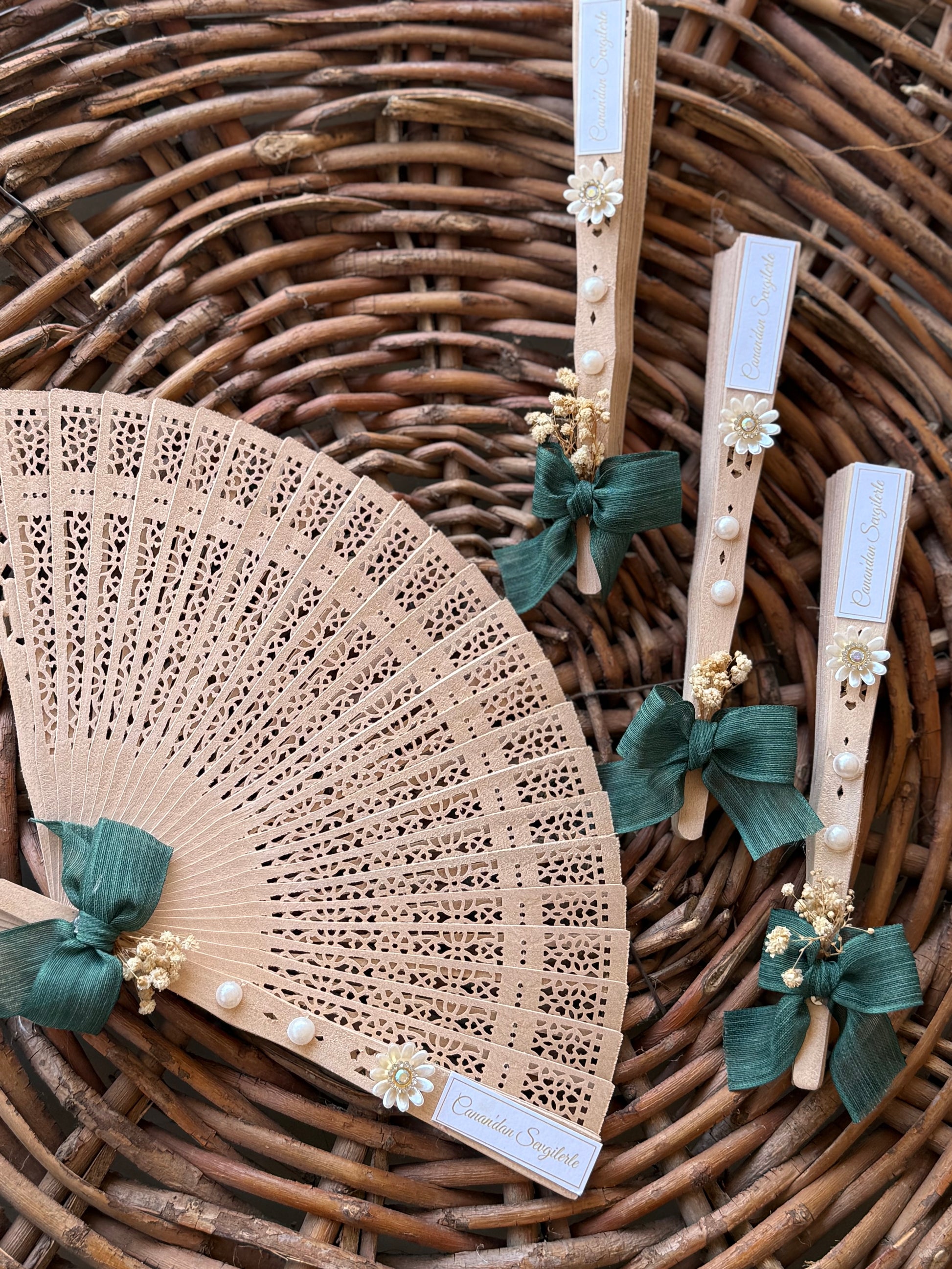 Doğal ahşap dokusuyla özenle tasarlanmış özel yelpaze hediyelik, zarif işlemeleri ve kişiye özel detaylarıyla en anlamlı günlerinizde misafirlerinize unutulmaz bir hatıra sunar. Üzerinde inci süslemeleri, yeşil kurdele ve minik kuru çiçek detayıyla tamamlanmıştır. Şeffaf kutusunda şık bir sunumla gönderilir.