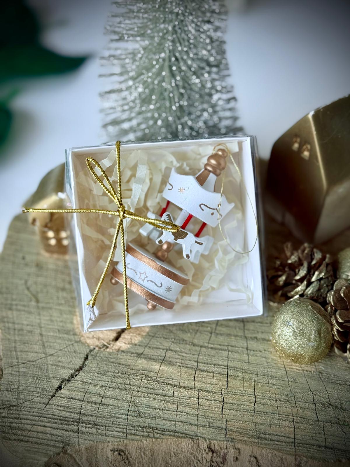 El yapımı ahşap mini atlıkarınca süs, şeffaf kapaklı hediye kutusunda altın renkli kurdele ile hazırlanmıştır. Hem dekoratif obje hem de anlamlı bir hediye olarak kullanılabilir. Özellikle yılbaşı, doğum günü, baby shower, söz/nişan veya özel davetlerde misafirlerinize unutulmaz bir hatıra sunar.