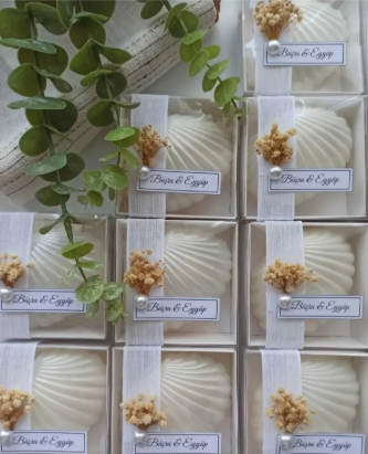 El yapımı istiridye tasarımlı mum, şeffaf kapaklı kutusu, doğal kuru çiçek detayı, inci süsleme ve kişiye özel isim & tarih etiketiyle sunulmaktadır. Minimal ve şık tasarımı sayesinde hem dekoratif obje hem de özel gün hediyesi olarak çok beğenilmekte.